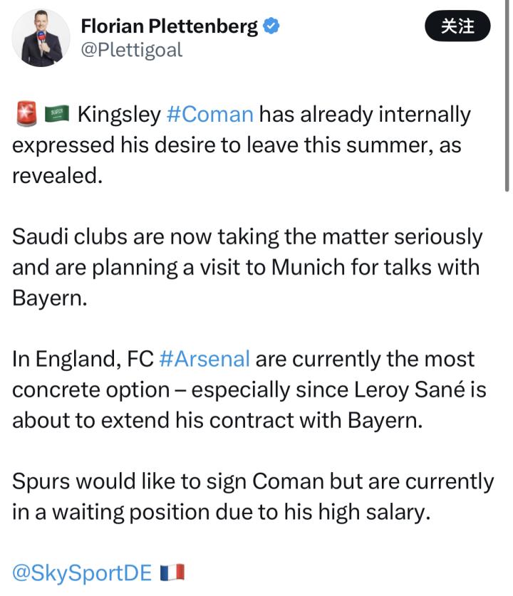 另外,北伦敦的另一支球队热刺也在关注金斯利-科曼的情况。然而,由于科曼的高薪水要求,热刺目前处于观望状态。他们可能会在后续时机做出行动,但目前还没有明确的计划。